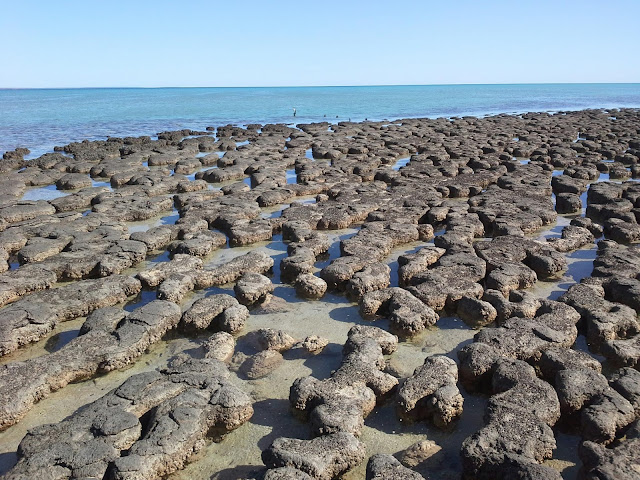 Entering into the Shark Bay World Heritage Area our first sight of the unusual were these stromatolites - these living things are built up by single celled organisms - cynobacteria - which are a very primitive form of life dating back 3.5 billion years. They flourish here because the saltiness of the bay restricts the number of predators they have. This particular group are over 3000 years old.