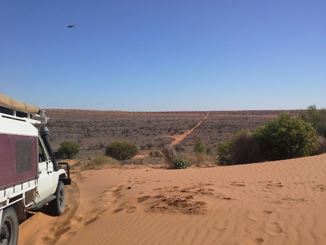 For those of you who haven't been to this amazing place let me try to give you a picture of what it is like. It is a sandy ridge desert, its most obvious characteristic being the remarkable system of parallel dunes which can rise up to 40m and can stretch for up to 200km. We calculated we crossed perhaps 2000+ of these!!! Then there's the solitude. During the trip at one stage we didn't see a car for 30hrs. We camped beside the road every night - a glorious sunset followed by a sky filled with more stars than you can remember seeing, the fire crackling, the flies disappear and the moths take over for the night shift and not a sound otherwise - you really do feel you are the only ones there. The temperature at night got down to 0deg but we were snug and warm in our sleeping bags and little tent house.The day times bring an equally magnificent sunrise and then about half an hour later hordes of flies back again. This is the signal to be getting on the road again.